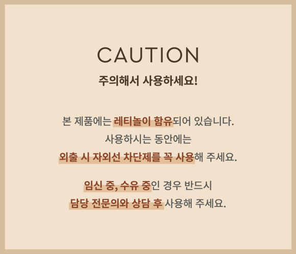 빛에 반응하는 레티놀 특유의 성질이 있으니 자외선 차단제를 바르고 사용하시는게 좋아요 :)