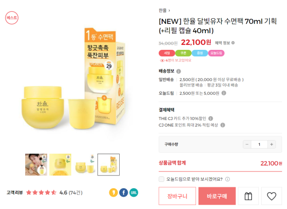 한율 달빛유자 수면팩은 용량이 70ml 로